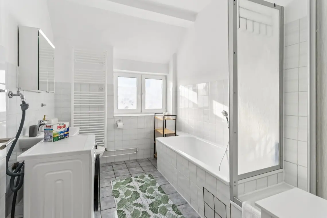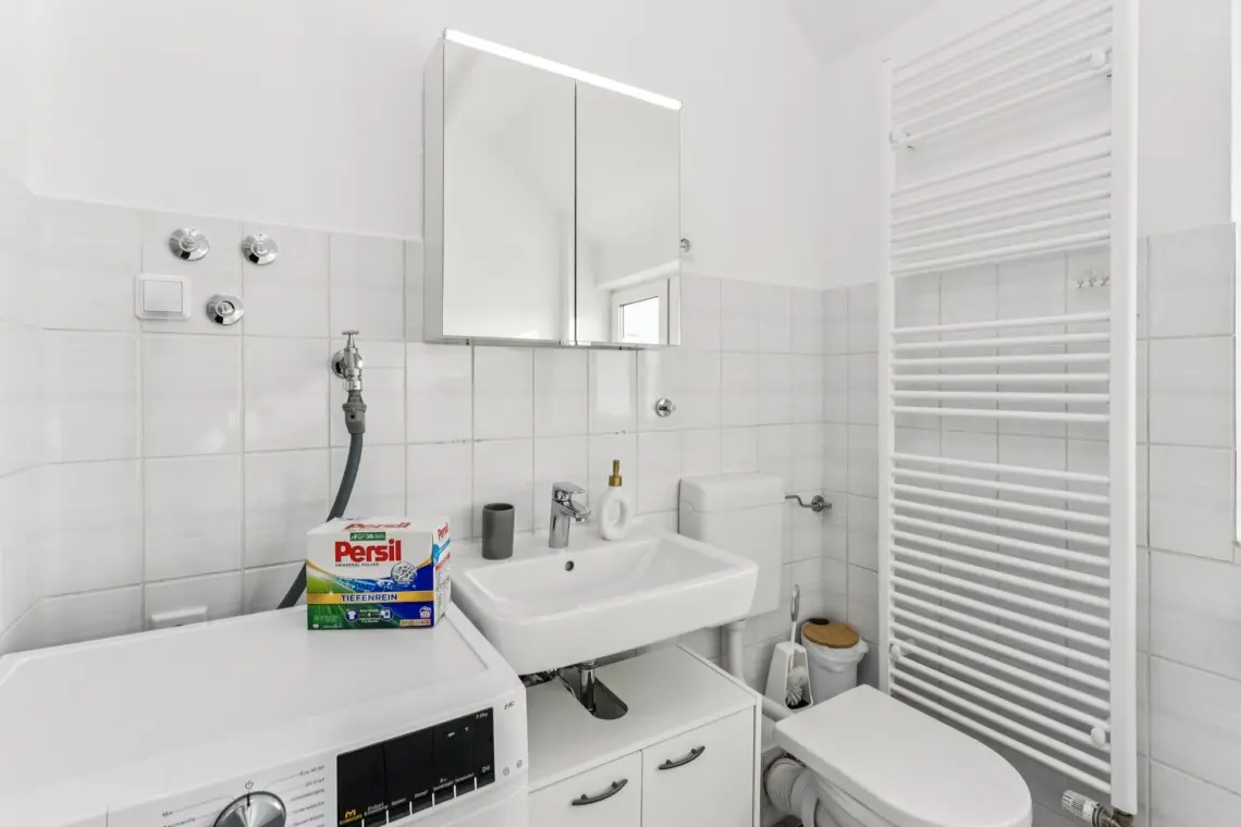 Helles Badezimmer mit Badewanne, Duschabtrennung, Toilette, Waschbecken mit Spiegelschrank, beheiztem Handtuchhalter und eigener Waschmaschine – perfekt für längere Urlaube.