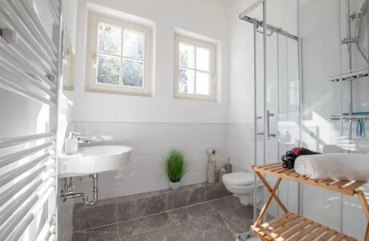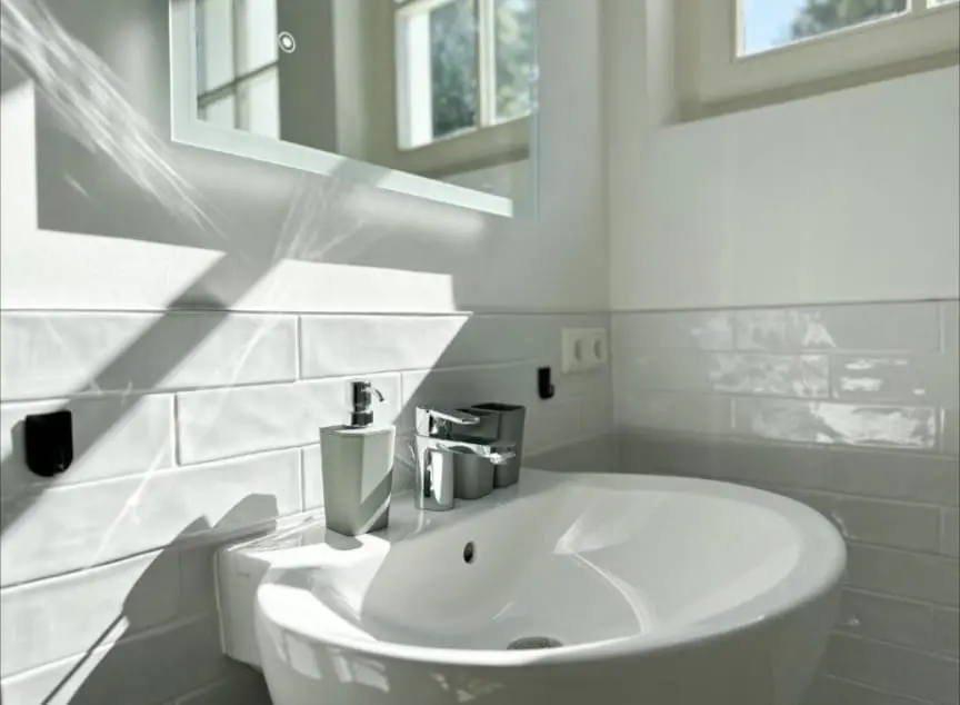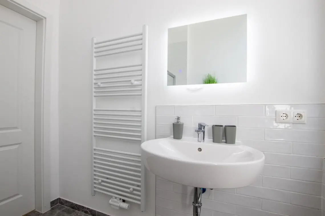 Das Badezimmer wurde frisch renoviert und verfügt über eine geräumige Glasdusche, einen beheizten Handtuchhalter, einen beleuchteten Spiegel und viel Tageslicht.